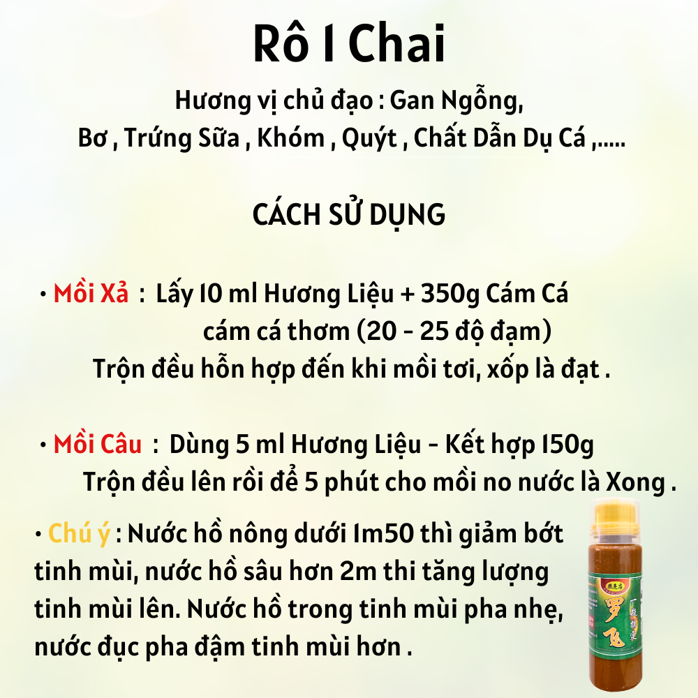 Đặc điểm nổi bật: Combo Xuân Hè chuyên Rô phi tỏa mùi nhanh, đánh ổ gọn, dính ổ tốt. Đã tối ưu cho cả nước trong và nước đục.